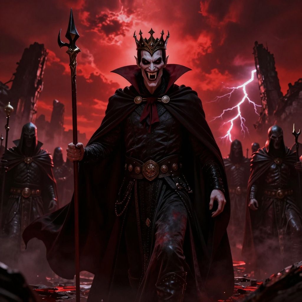 A vampire overlord commanding an army of undead warriors beneath a blood-red sky, his sinister smile revealing elongated fangs, dark flowing cape and ornate crown, ruins and lightning cracking in the distance