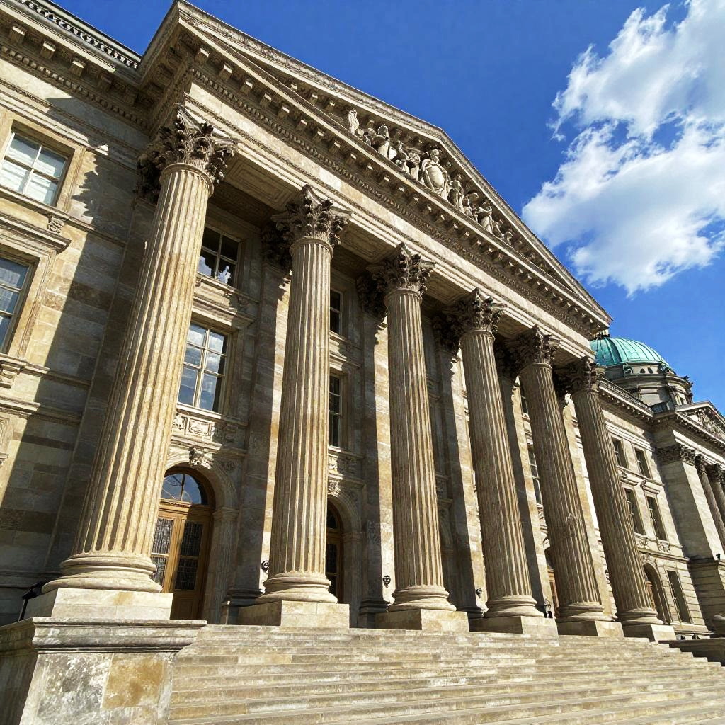 Photograph of a grand, classical-style building with tall, ornate columns made of light brown stone. The perspective is low-angle, emphasizing the columns' height and the building's impressive facade. The sky in the background is bright blue with some white clouds. The building features intricate cornices and a domed roof on the right side. The steps in the foreground are wide and symmetrical.