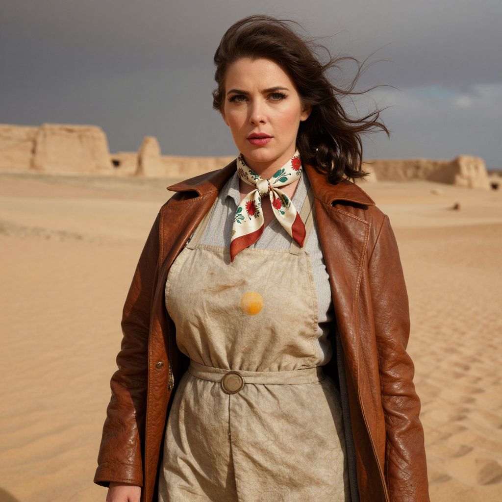 Photograph of a confident woman with dark hair, wearing a brown leather jacket, beige apron dress, and red floral scarf, standing in a sandy
