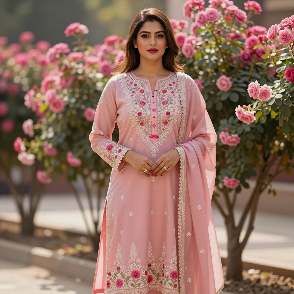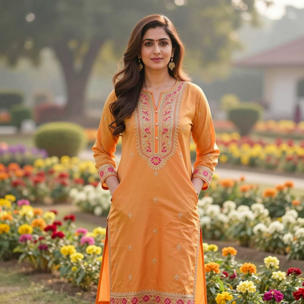 Trendy salwar suit design, photorealistic, full-body shot of Indian woman, standing in sunlit garden, wearing traditional dark blue salwar kameez with intricate orange and red floral embroidery, loose dark blue pants, brown sandals, long straight brown hair, green eyes, small red bindi, neutral expression, bright sunlight, blurred green plants and pink flowers in background, daytime, realistic ures, natural light, Indian ethnicity, casual pose, portrait orientation, colorful embroidery, traditional clothing.