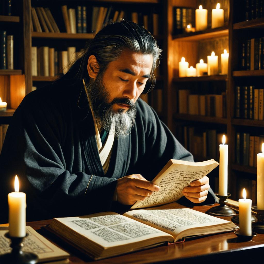 An elderly Asian man with a flowing grey beard and long black hair is deeply engrossed in reading an ancient scroll in a dimly lit study. The room features shelves filled with old books and is softly illuminated by numerous flickering candles, creating a warm, contemplative atmosphere. The man is dressed in traditional dark robes, enhancing the scholarly and historic setting.