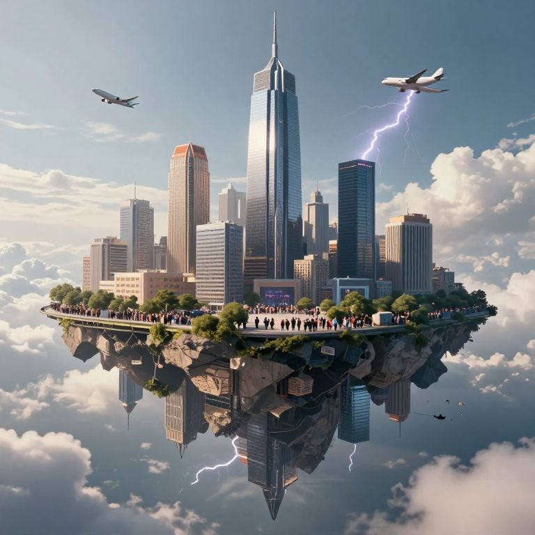 Digital illustration of a floating, reflective cityscape with skyscrapers, a lightning strike, two airplanes, and a crowd on a rocky island amidst clouds