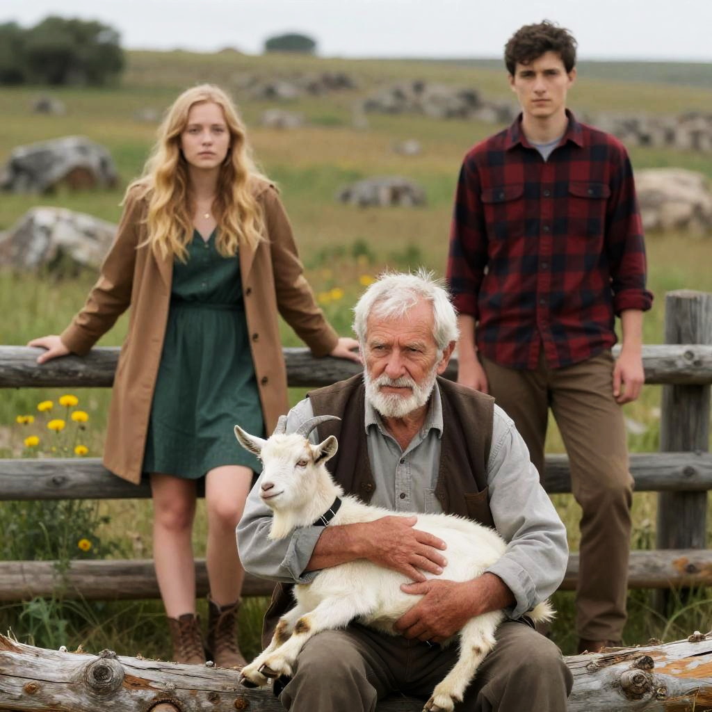 Photograph of a crowded sheep herd surrounding a bright red vintage car. A man with dark hair and mustache, wearing a light shirt and tie, stands by the open driver's door. Another man in a dark coat stands to the left. Sheep are pressing against the car, heads visible in the foreground. Overcast outdoor setting.
