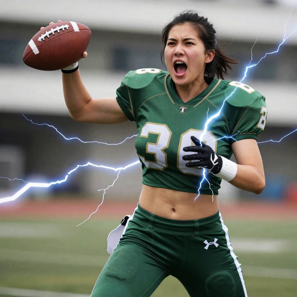 Photography, masterpiece, best quality, HDR, highres, realistic details, 40K, open mouth, yelling, charge posture, large breasts, Cameltoe, 1girl, leilinggeng, lightning, Lots of lightning, drawing, lightning elemental energy towards himself, on stomach, Fighting posture, a woman playing american football, (wearing football_uniform:1.3), green uniform, good hand