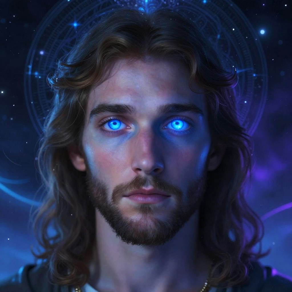 Photorealistic digital artwork of a young man with long, wavy brown hair and a short beard. His piercing blue eyes glow intensely, casting an ethereal light. He has a fair complexion and a slightly serious expression. A halo of blue and purple cosmic lights surrounds his head, with a starry background featuring nebulous clouds. The image has a surreal, otherworldly feel, blending realistic human features with celestial elements, creating a mystical, divine appearance.