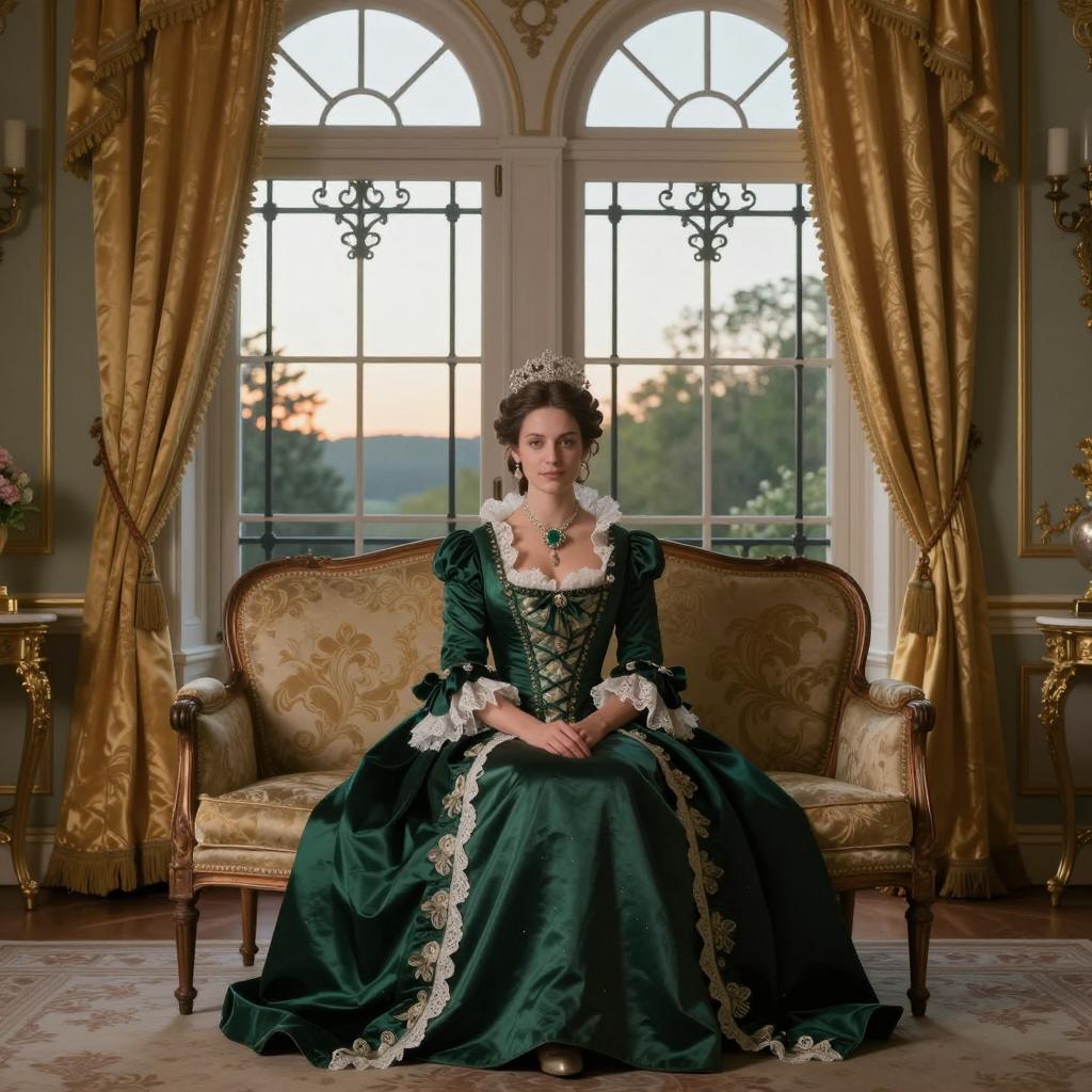 A portrait of a noblewoman dressed in an elegant dark green gown with white lace details, seated gracefully on a vintage settee in a classical interior. The room features large arched windows with ornate ironwork and heavy luxurious gold curtains. The ambiance is serene and regal, illuminated softly by natural light from the grand windows during early evening.
