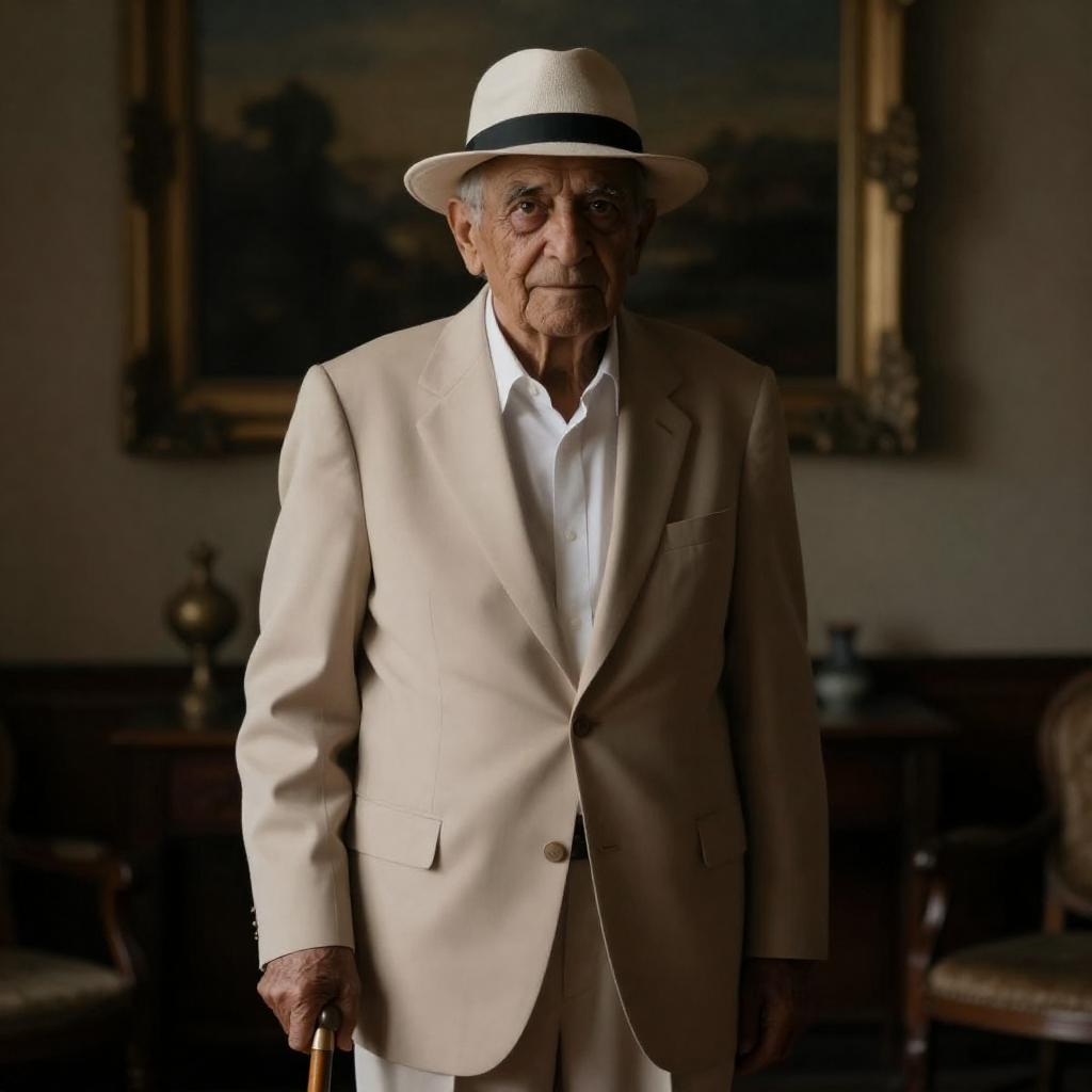 Photograph of an elderly white man with a weathered face, wearing a white naval officer's cap and sunglasses, a white button-up shirt, and a wooden pipe in his mouth. He stands in profile, illuminated by sunlight, with a blurred indoor background. His hands are behind his back.