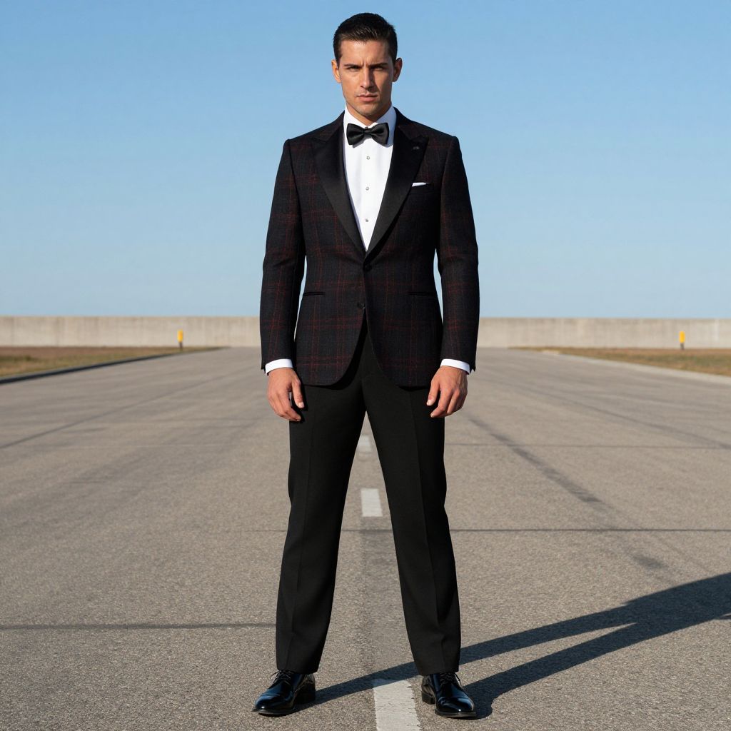A man, traditional black and red tartan dinner jacket, white tuxedo shirt, black satin bow tie, straight-leg black trousers, elegant black patent leather shoes, sprawling tarmac under a clear blue sky, overhead shot, confident expression Man has masculine face and piercing eyes