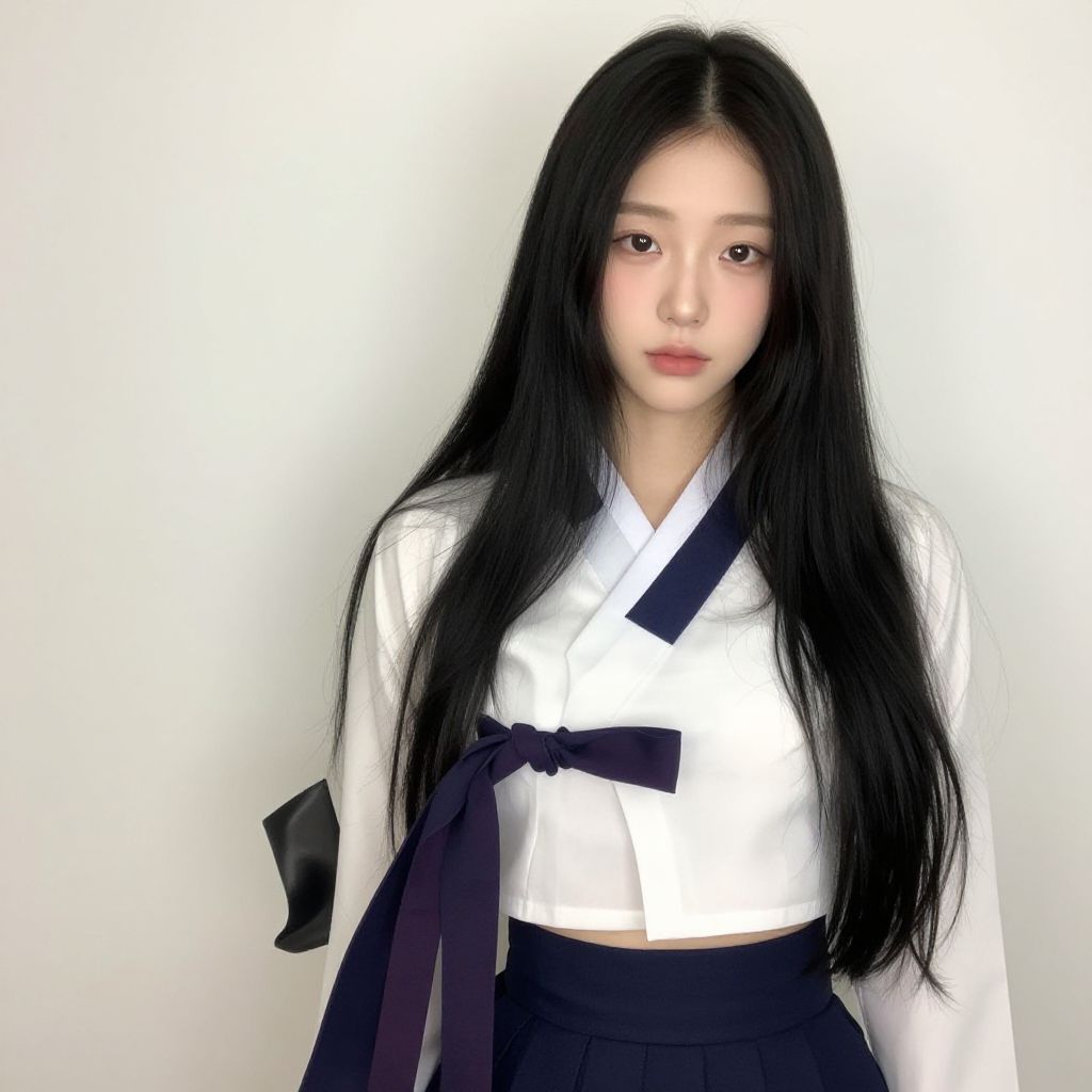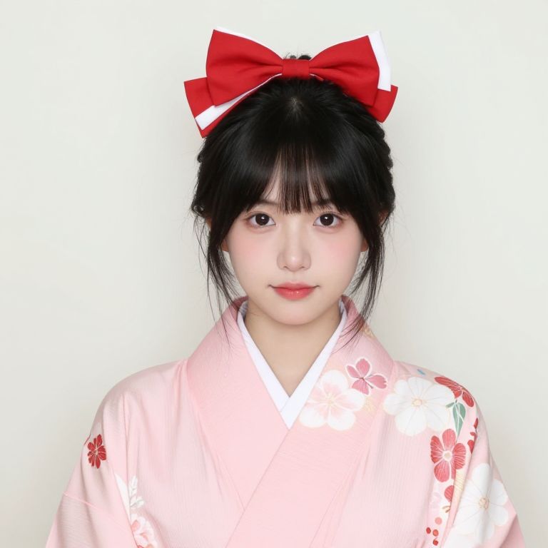 Asian girl with long brown hair, wearing a red kimono with gold embroidery and a red bow on the neck.