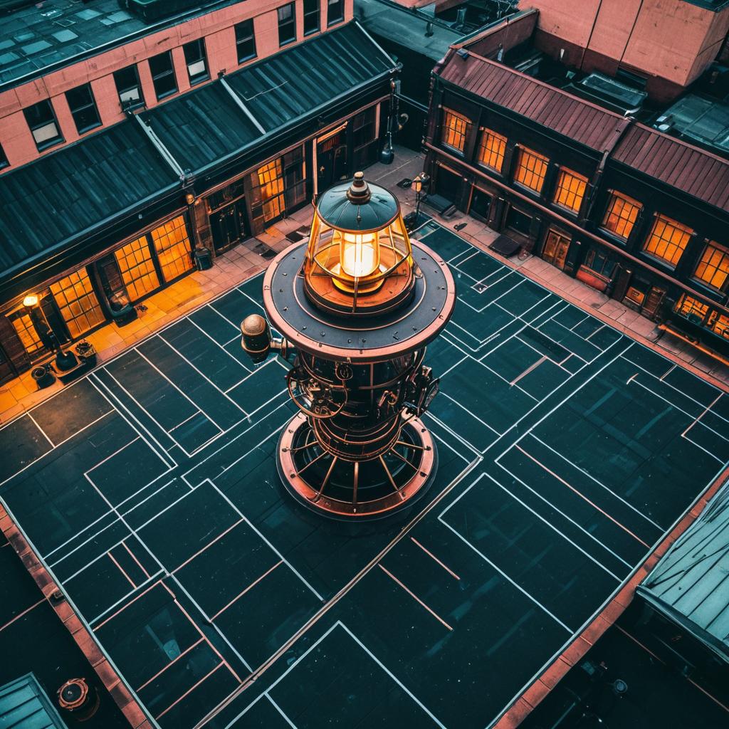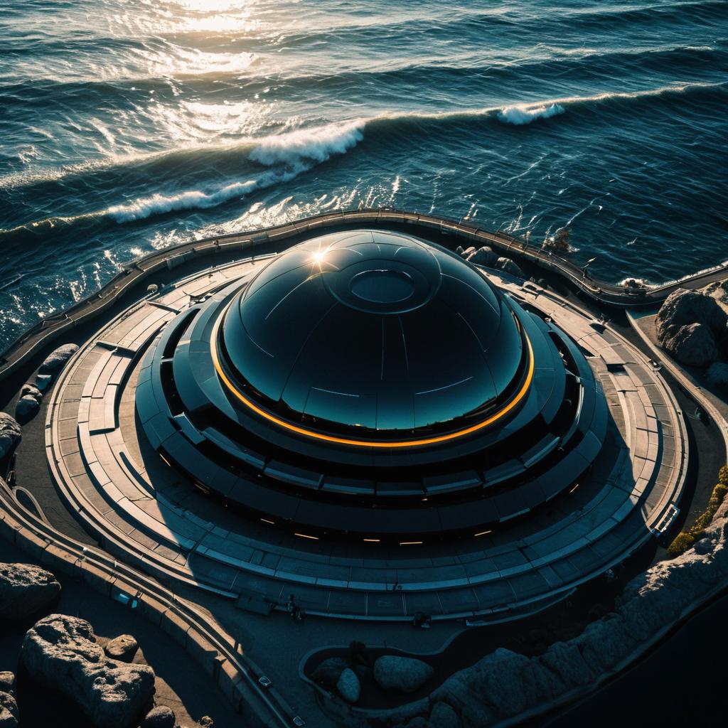 Aerial view of a futuristic circular building with a glossy obsidian dome and concentric circular structures, located by the seaside. The design features sleek, modern architecture with symmetrical lines, illuminated by backlight creating reflective effects on the dome. Surrounding the building is a coastal area with waves gently hitting the shore and several parked vehicles nearby.