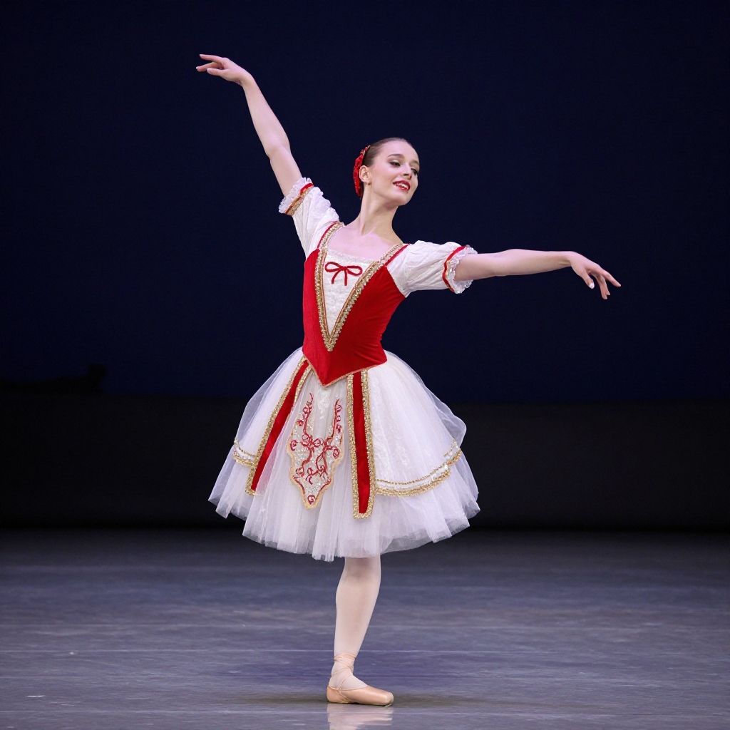 Ivanovna portrayed as a classical ballet dancer mid-performance, vibrant red and white costume catching the stage lights, graceful pose with delicate hand movements, dramatic dark theater backdrop accentuating her elegance and passion.