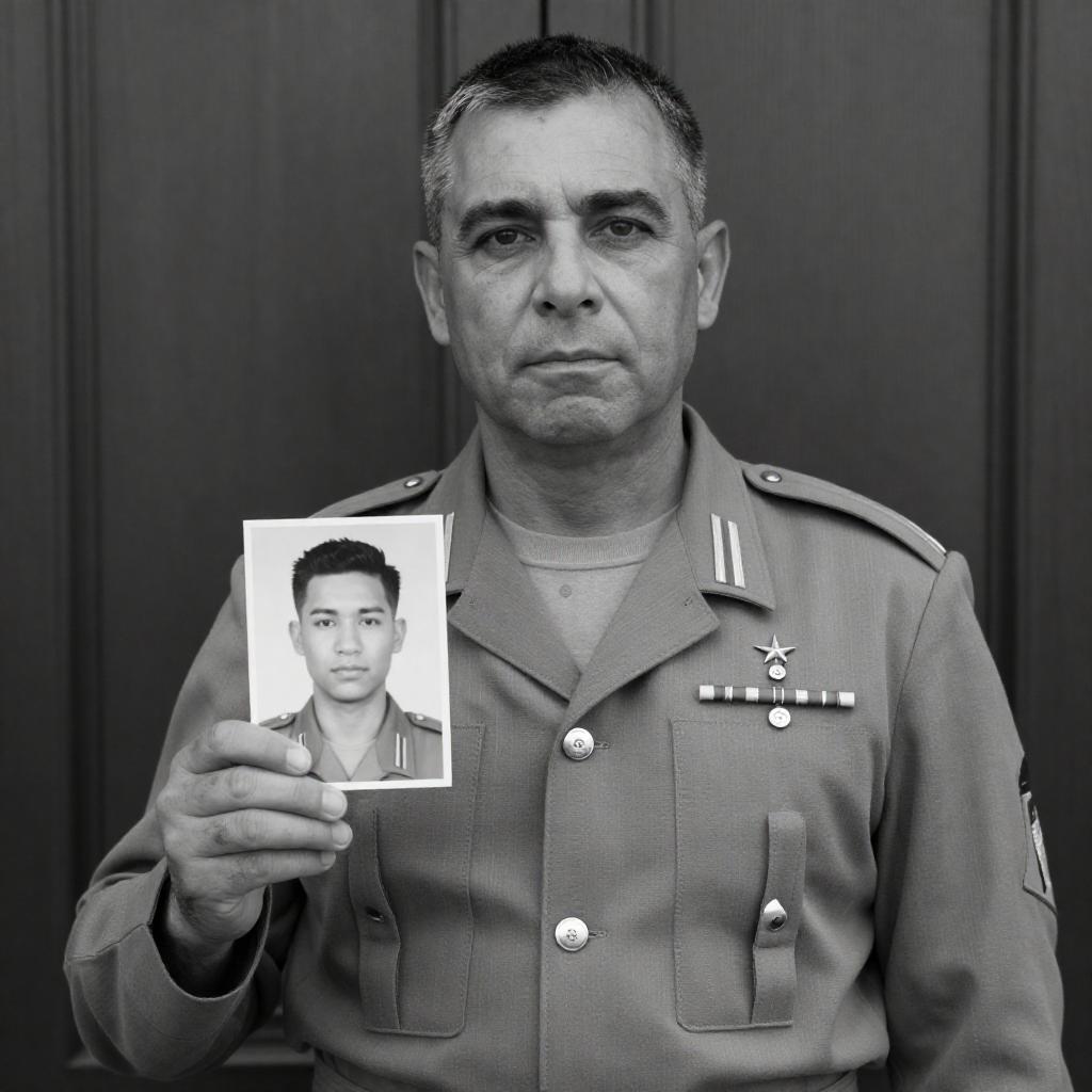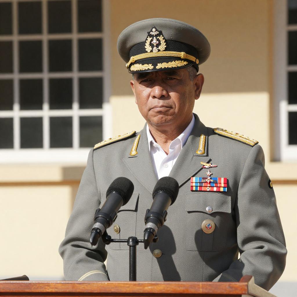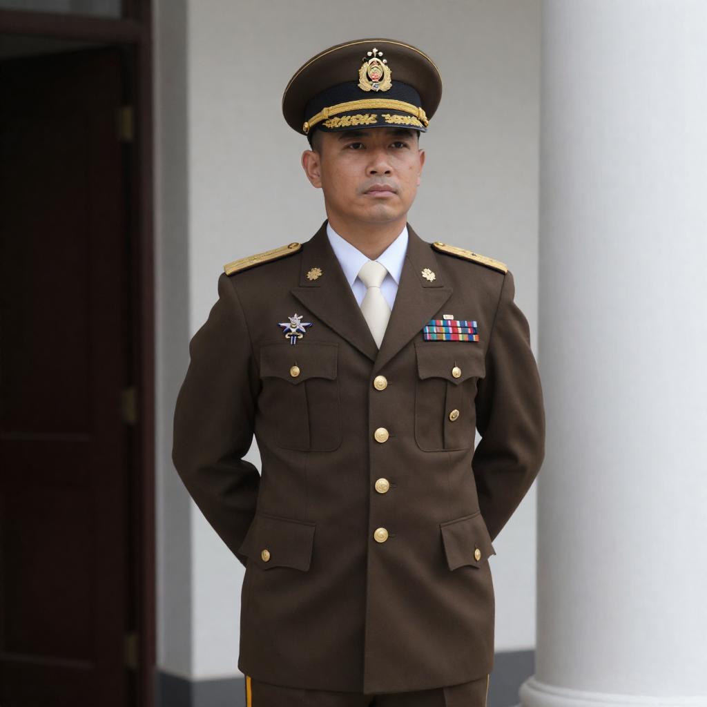 Photograph of a middle-aged man in a green military uniform with medals, standing in front of a large, illuminated world map. He has short dark hair, a mustache, and a serious expression. The map has red and blue regions, with notes and a sign partially visible on the left. Warm lighting highlights the map's details.
