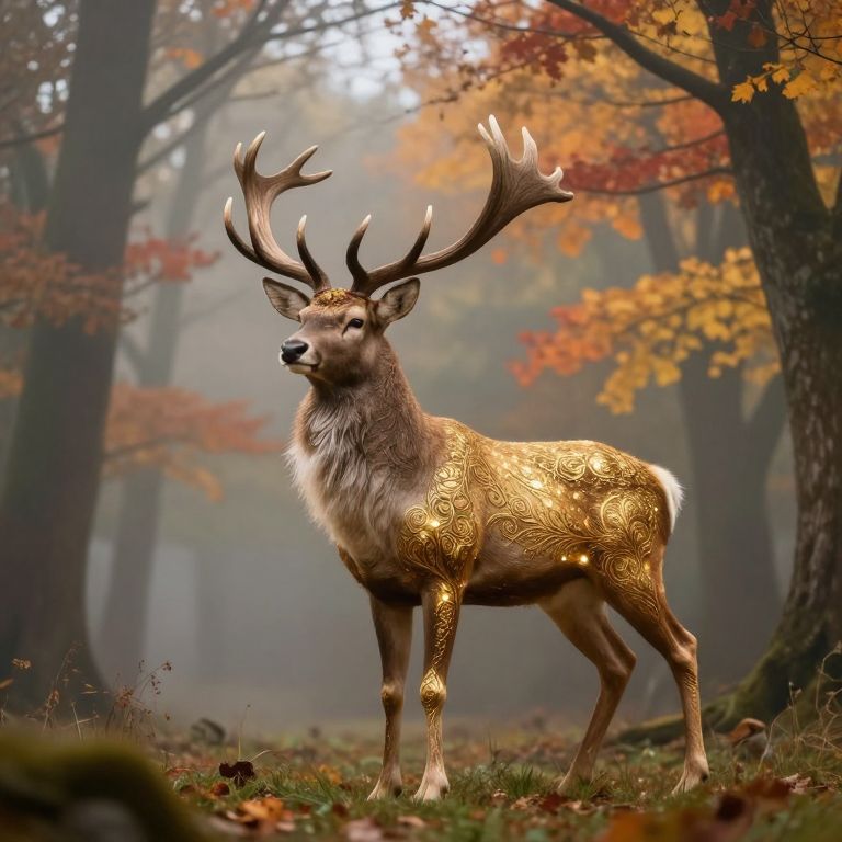 Envision an enchanting scene where a magnificent stag with gleaming antlers stands resolute in a foggy forest glade. The creature is embellished with intricate filigree patterns that sparkle like golden sunlight filtering through autumn foliage, embodying both mythical and royal essence against the backdrop of vibrant, hand-painted trees that seem to pulse with life. From an low-angle viewpoint, this image captures the tranquil grandeur of the stag as it stands tall amidst its captivating surroundings, evoking a sense of wonder, serenity, and admiration for the harmonious blend of nature's beauty and artistic prowess.