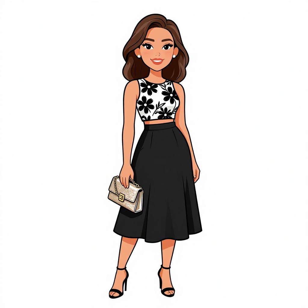 A digital illustration of a young woman with fair skin and shoulder-length brown hair. She wears a sleeveless white blouse with black floral patterns, a high-waisted black skirt that reaches mid-calf, and black high-heeled sandals. She holds a small, white clutch bag in her right hand. Her makeup includes red lipstick and subtle eye makeup. The background is plain white, emphasizing the stylish outfit and confident pose. The illustration is in a modern, cartoonish style with bold, clean lines and vibrant colors.
