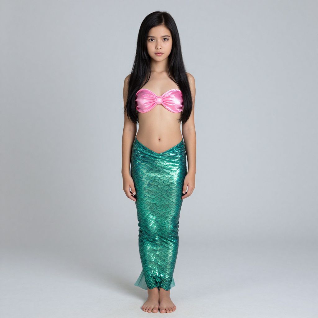 "adult little mermaid costume, 1girl, mermaid, solo, monster girl, black hair, long hair, realistic, brown eyes, lips, full body, breasts Realistic photo of casual sexy person with pretty face"