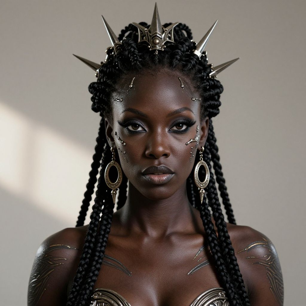 The image showcases a highly detailed and realistic portrait of an anthropomorphic black alien woman, exuding a sense of otherworldly elegance and power. Her face is adorned with intricate, metallic face paint and dermal anchors, creating a striking contrast against her dark skin. The woman's hair is styled in elaborate braids, crowned with a crown that features sharp, angular spikes, adding to her regal appearance. Her eyes are accentuated with bold, dramatic makeup, and she wears large, circular earrings that dangle from her ears, further enhancing her striking visage. The woman's shoulders and upper arms are covered in detailed, metallic tattoos, which appear to be part of her body modification. The lighting in the studio is soft and natural, with a subtle sunbeam effect that highlights the textures and contours of her skin and the metallic elements. The overall composition is balanced, with the woman's face and upper body centered in the frame, creating a sense of symmetry and focus. The use of high bit depth and natural colors in the photograph ensures a realistic and authentic representation of the subject.