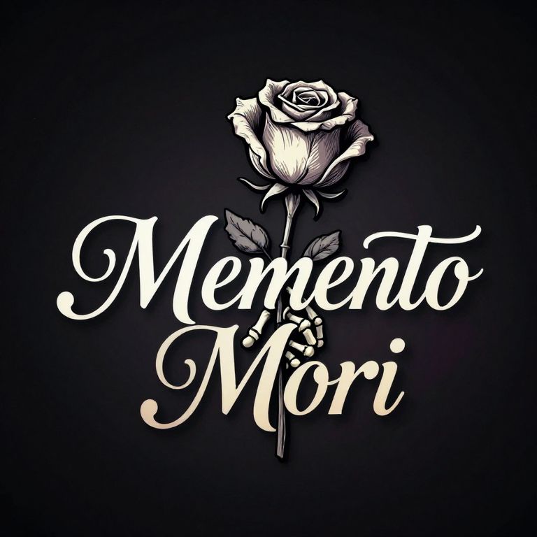 Memento mori logo with a skeletal hand holding a wilting rose, classic calligraphy letters, subtle gradients on dark background, symbolic and haunting atmosphere, artistic emblem style