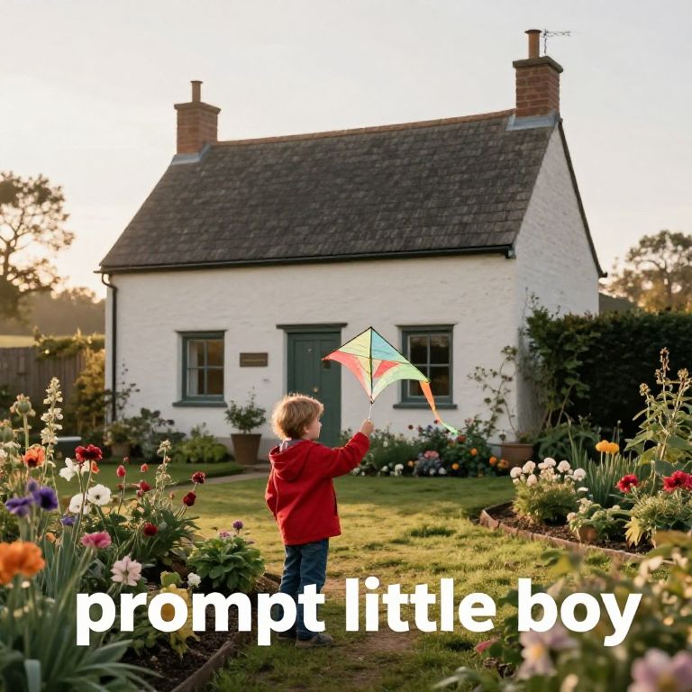 A cozy countryside cottage at sunrise, featuring a little boy standing near a flower garden, wearing a red jacket and holding a paper kite; the keyword 'prompt little boy' highlights a warm, realistic atmosphere with soft lighting and natural details.