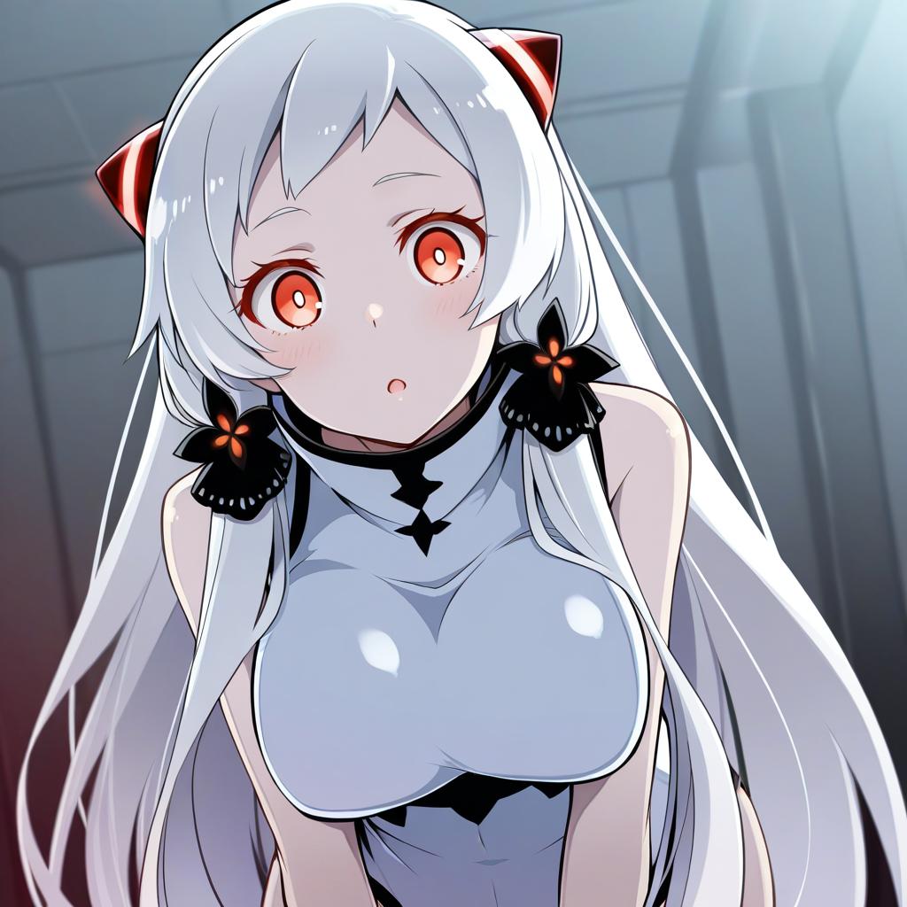 Airfield princess, kantai collection, 1girl, white skin, pale skin, horns, red eyes, white hair, very long hair, long hair, large breasts, by artist yutamaro, illustrious