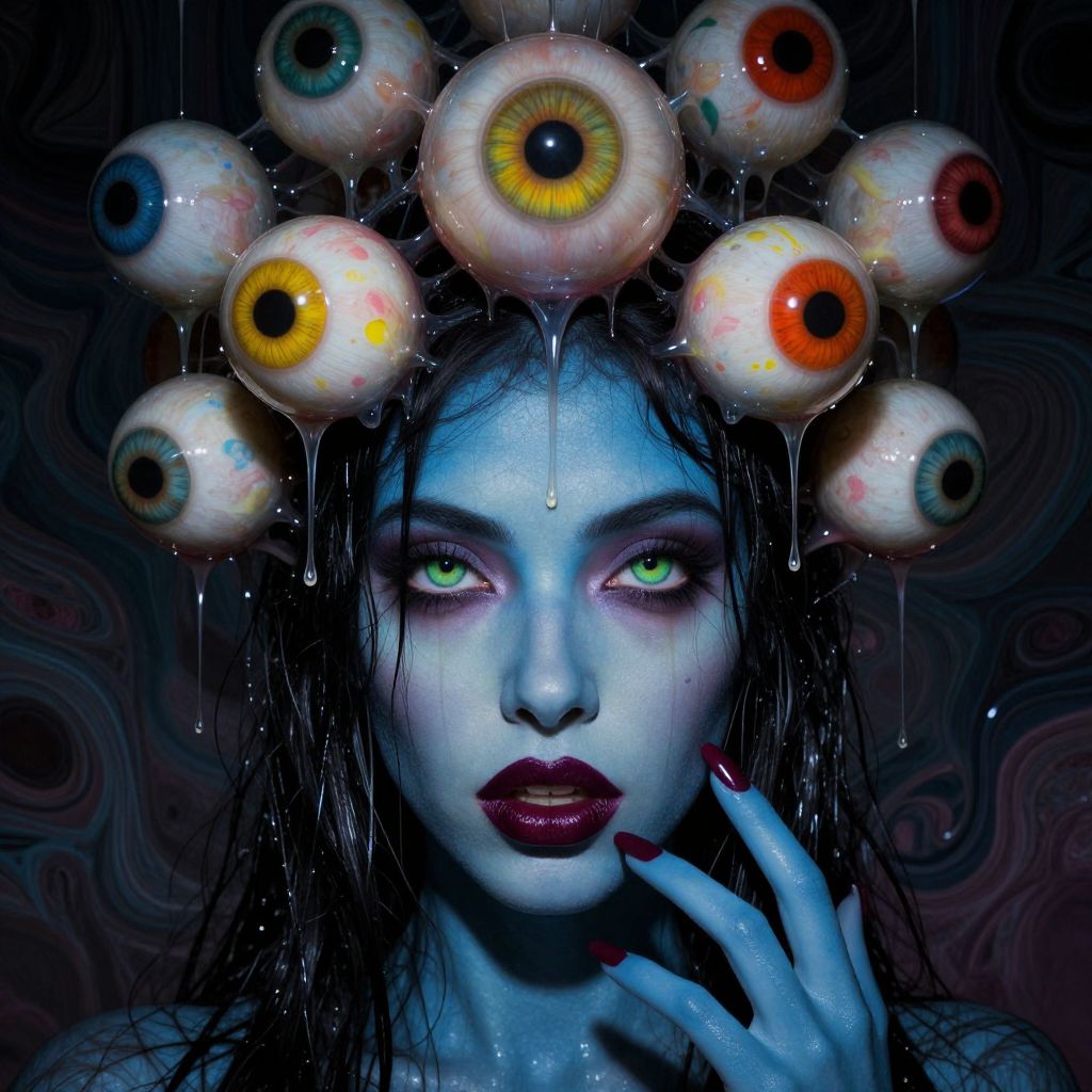 A surreal and highly detailed 8K digital illustration of a close-up view of a woman with an otherworldly expression, her vivid, ethereal blue skin contrasting sharply with her intense green eyes, Wet strands of her dark hair cascade around her face, while her bold deep-red lips and glossy, manicured fingernails add a striking vibrancy, Above her head, multiple eyeballs of varying sizes and colors—ranging from deep blues and greens to bright yellows and reds—drip like liquid in a surreal, disturbing display, These eyeballs are intricately detailed, their irises and pupils highly realistic, suspended in a viscous, unnatural substance that adds to the eerie aesthetic, The dark, abstract background features swirling, chaotic patterns and more dripping liquid, complementing the unsettling mood, Dramatic, cinematic lighting highlights the sharp contours of her face, casting deep shadows that emphasize her unsettling beauty and the surreal elements around her, The composition masterfully blends realism and surrealism, creating an intricate and emotionally charged scene designed to evoke mystery, tension, and awe, capturing a bold artistic vision