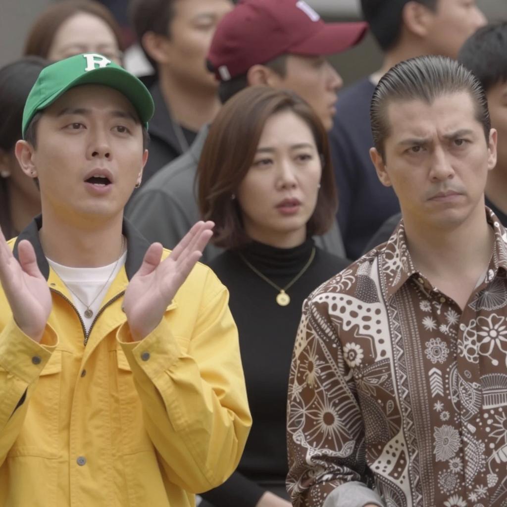 Three people in a crowded setting. Left: man with green cap, yellow jacket, necklace, open mouth, hands raised. Center: woman with short brown hair, black turtleneck, gold badge. Right: man with slicked-back brown hair, brown and white patterned shirt, serious expression. Background: other people, one with red hat. Casual, colorful attire, slightly blurred background.