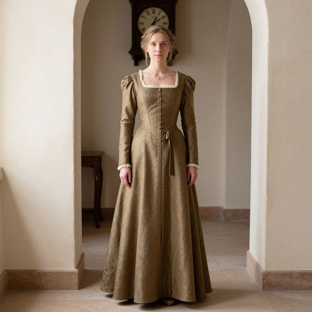 Photograph of a woman standing in a sunlit arched doorway. She has light skin and brown hair, styled in a simple updo. She wears a long, gold-brown, Victorian-style dress with puffed sleeves and a square neckline, adorned with white lace at the cuffs and neckline. The dress has a fitted bodice with buttons down the front and a full, flowing skirt. Behind her, a dark wooden clock with a white face is mounted on a beige wall. The floor is tiled in a light brown color. The lighting highlights the texture of the dress and the softness of the walls.