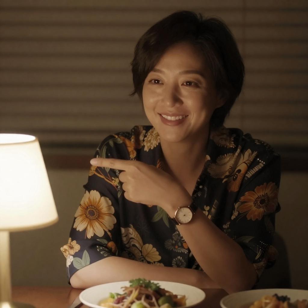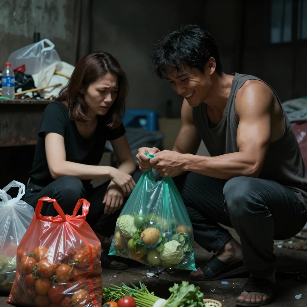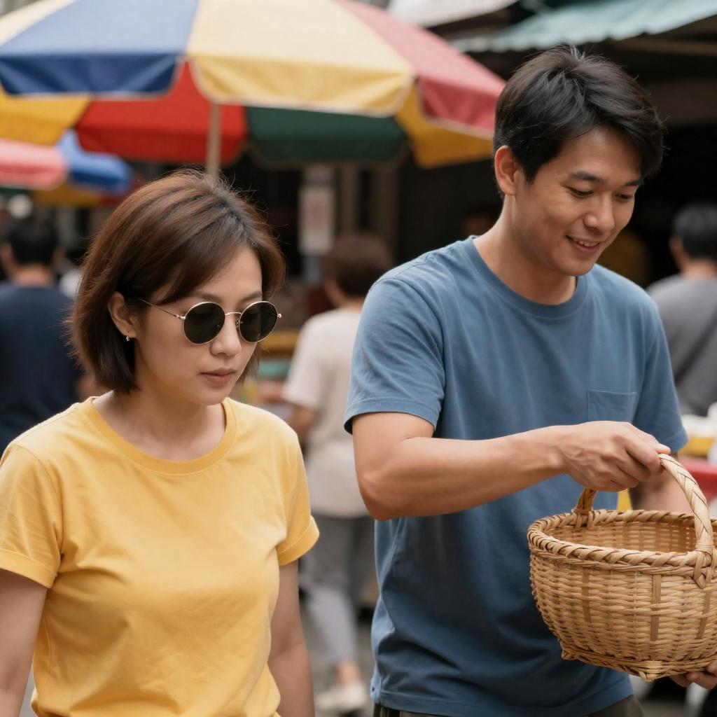 Photograph of two Asian individuals in a dimly lit restaurant. Man in brown plaid shirt and hat, stirring food with chopsticks. Woman in black polka dot shirt, smiling. Grill with meat and greens on table. Bottle of beer in background. Both seated.