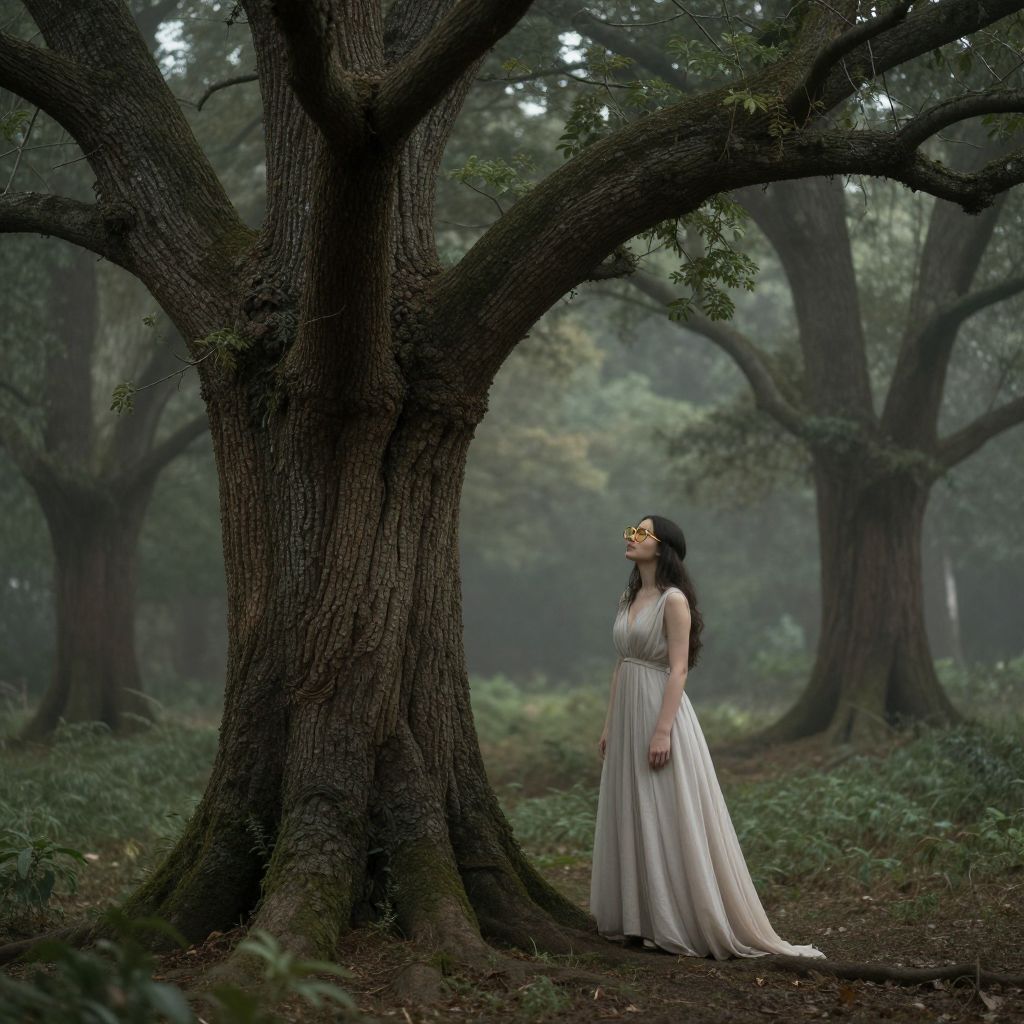In a misty forest where time seems to stand still, a sentient tree adorned with golden spectacles shares its wisdom with a woman in a flowing gown, their connection bridging the gap between the eternal serenity of nature and the transient hopes of humanity.