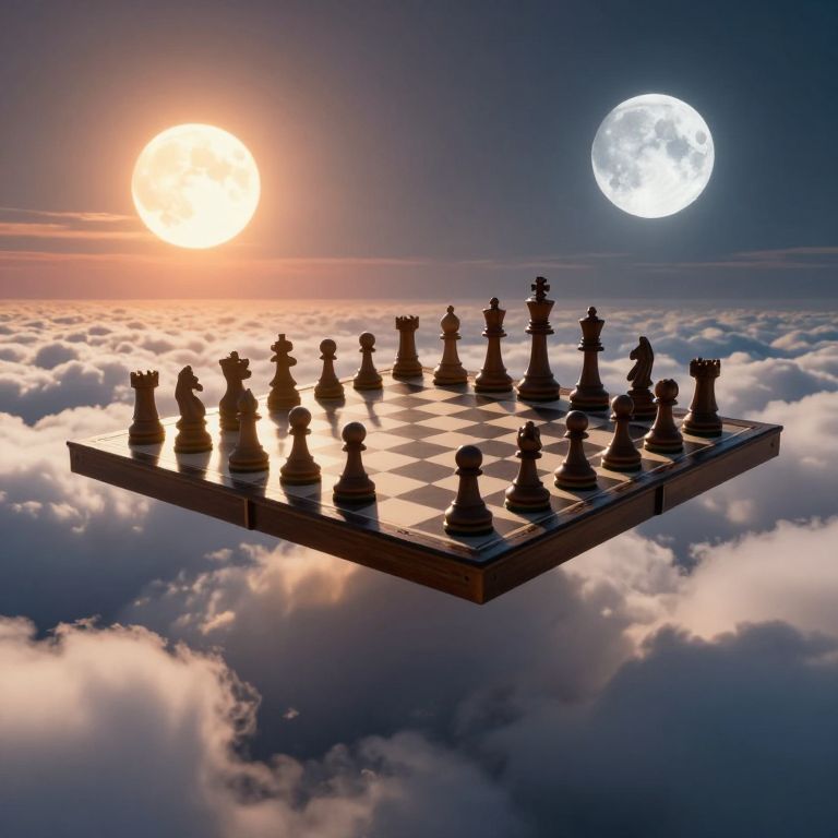 A floating chessboard hovers serenely above a sea of clouds, its dark pieces cast in dramatic light by a fiery sun and a luminous moon, creating a surreal tableau where cosmic forces converge in a game of celestial strategy.