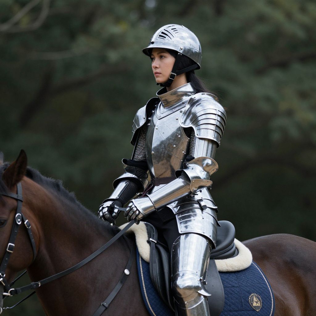 Lady rider costume, riding, armor, helmet, 1girl, outdoors, horse, horseback riding, shoulder armor, tree, solo, pauldrons, long hair, black hair, breastplate
