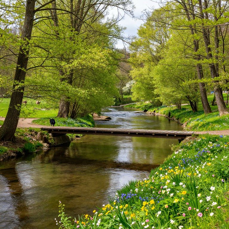 Kurpfalz river winding through dense forest, early spring bloom with colorful wildflowers, timber bridge crossing clear water reflecting the sky, wildlife including deer and birds, vibrant natural colors, photorealistic style, peaceful and enchanting atmosphere