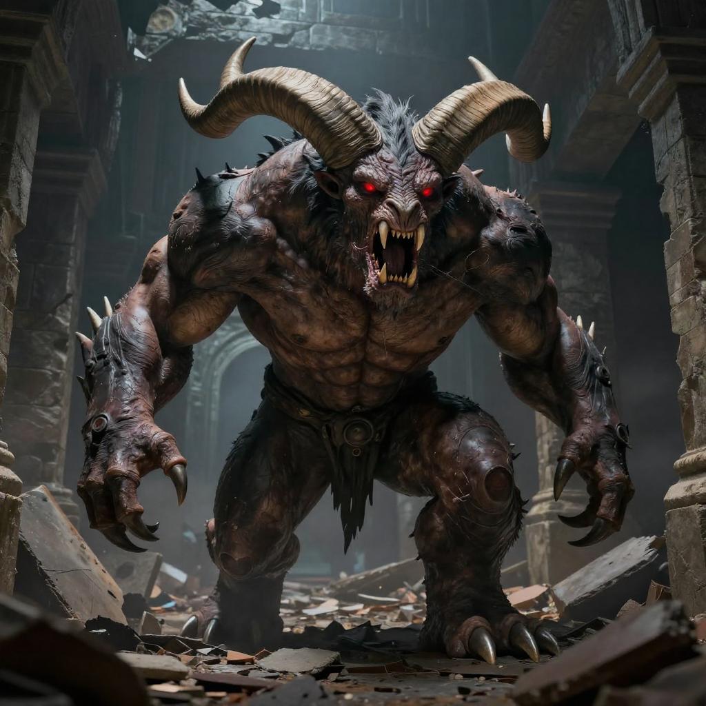 Hyper-realistic digital artwork of a giant muscular monster with large curved horns, sharp claws, and fangs. The creature has glowing red eyes, a fierce expression, and is positioned in a ruined stone corridor surrounded by debris. The atmosphere is dark and ominous, rendered in a detailed and cinematic art style inspired by Brom, Whelan, Aly Fell, Rutkowski, Art Germ, Rossdraws, and Franzzeta.