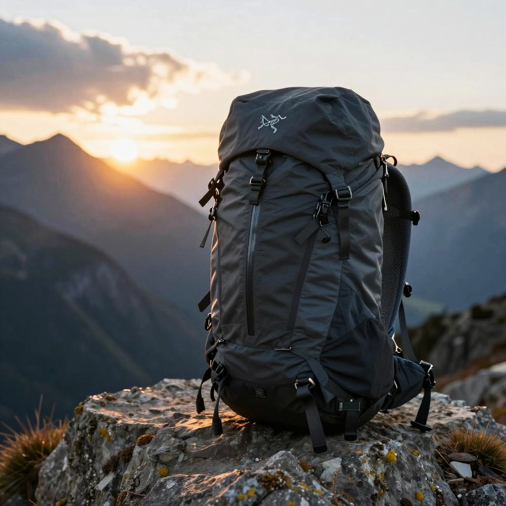 Arc'teryx outdoor gear displayed on a rugged mountain summit at sunrise, detailed textures of high-performance jackets and backpacks, crisp alpine environment with dramatic clouds and rocky peaks, photorealistic style, emphasizing adventure and durability.