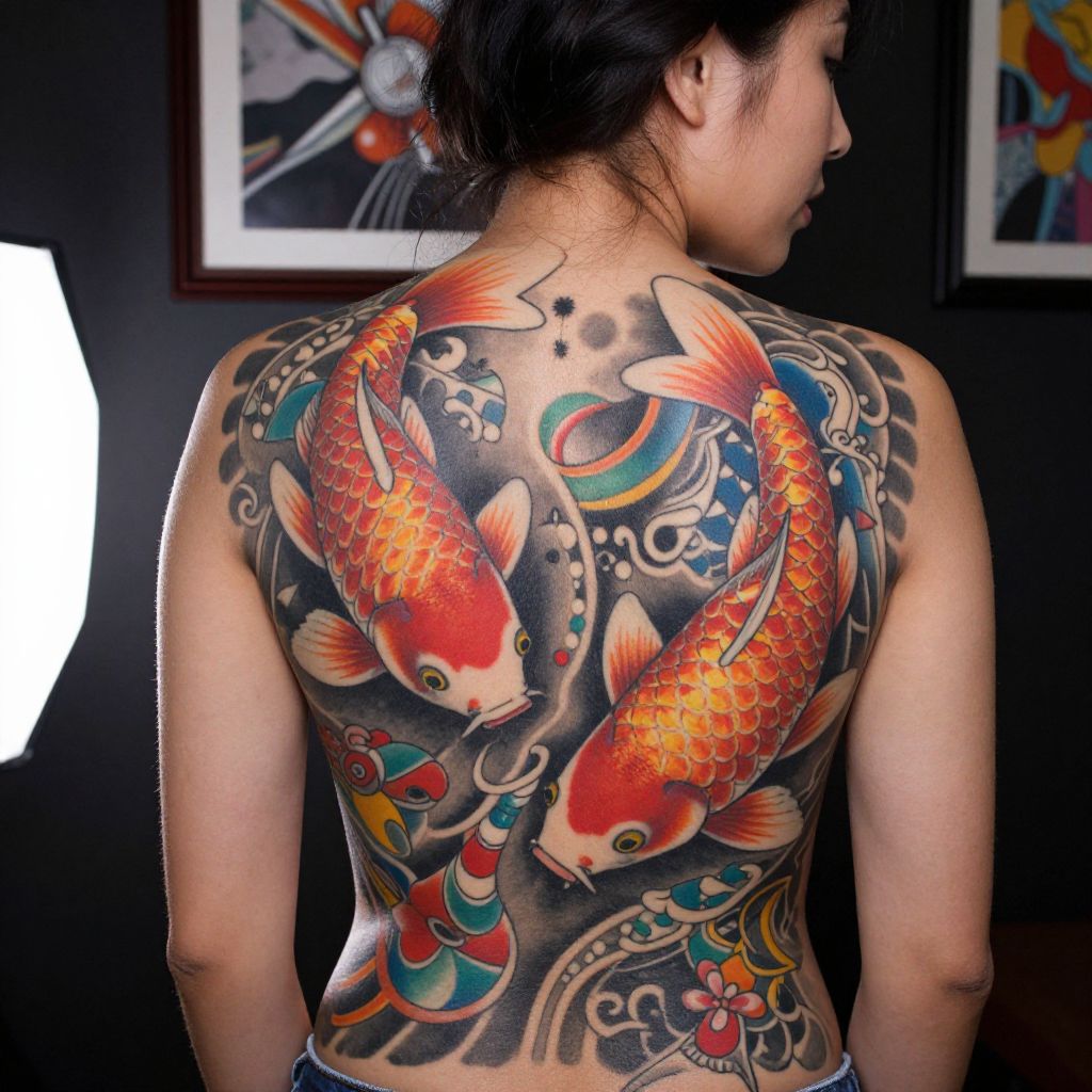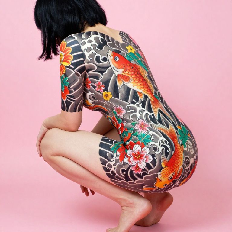 Photograph of an Asian woman with black shoulder-length hair, crouching on pink background. She wears a tight, form-fitting bodysuit covered in vibrant Japanese-style tattoos featuring colorful koi fish, flowers, and abstract patterns in black, orange, red, green, and white. Her skin is pale, and her legs are bent, showing her bare feet. The tattoo design is intricate, with bold lines and vibrant colors, covering her back, arms, and sides. The overall image has a high contrast and sharp detail, emphasizing the vividness of the tattoo against the soft pink background.