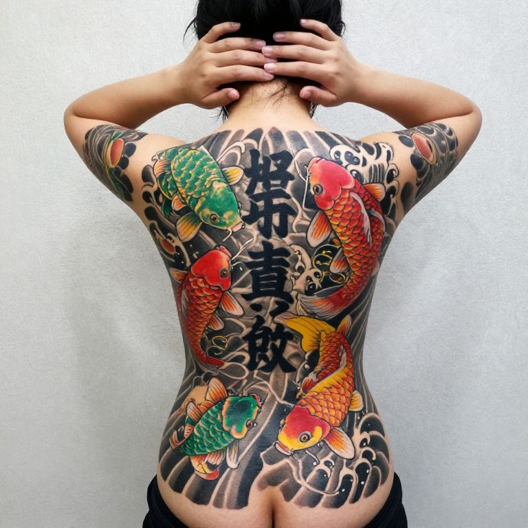 Photograph of a woman with black hair, squatting, wearing a vibrant, full-body, Japanese-style tattoo bodysuit with colorful koi fish