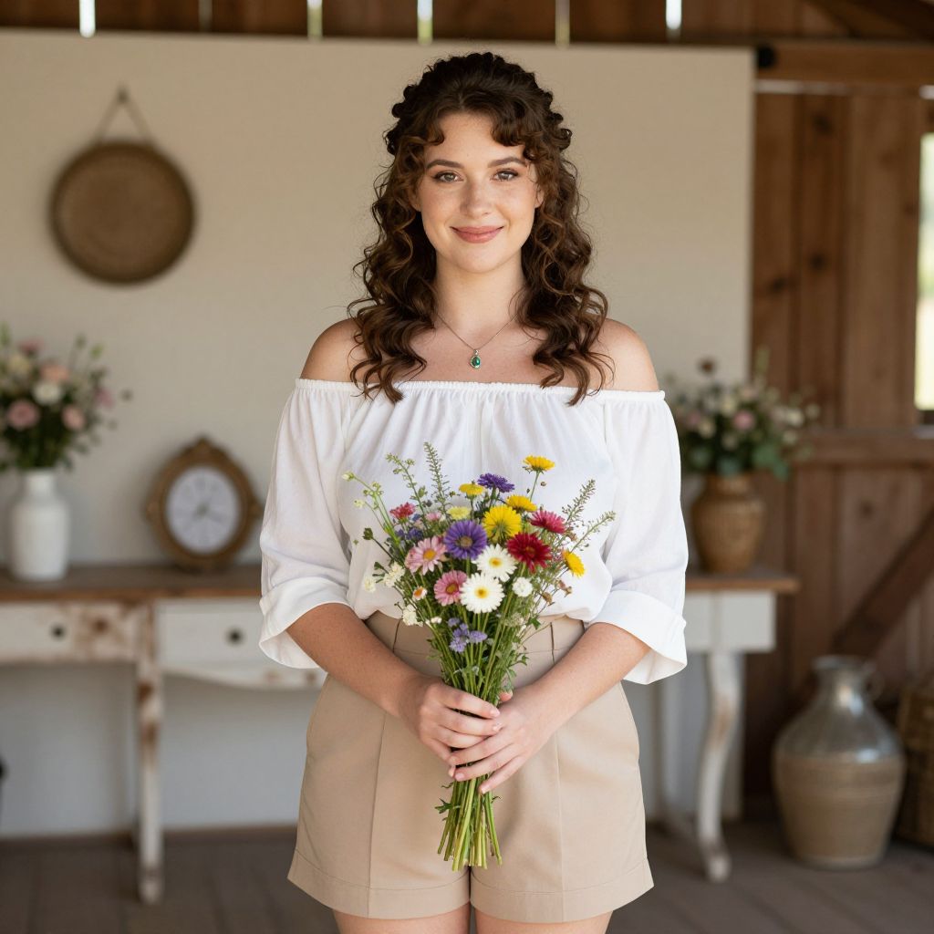 A softly styled casual wedding hairstyle with curls and a messy half-up do, a radiant woman with fair skin, curly brown hair, and a kind, friendly smile stands in a rustic barn with vintage wedding decorations, wearing a relaxed white off-shoulder blouse and tailored beige shorts as a casual wedding costume, holding a bouquet of wildflowers in her hands. The woman has big tits and cute face