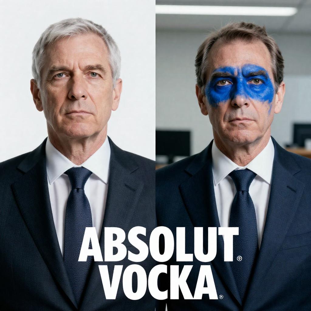 Photograph of two men in suits. Left: older man with short gray hair, serious expression, white background. Right: older man with blue face paint, serious expression, office background. Absolut Vodka power poster composition. Both men looking upward.