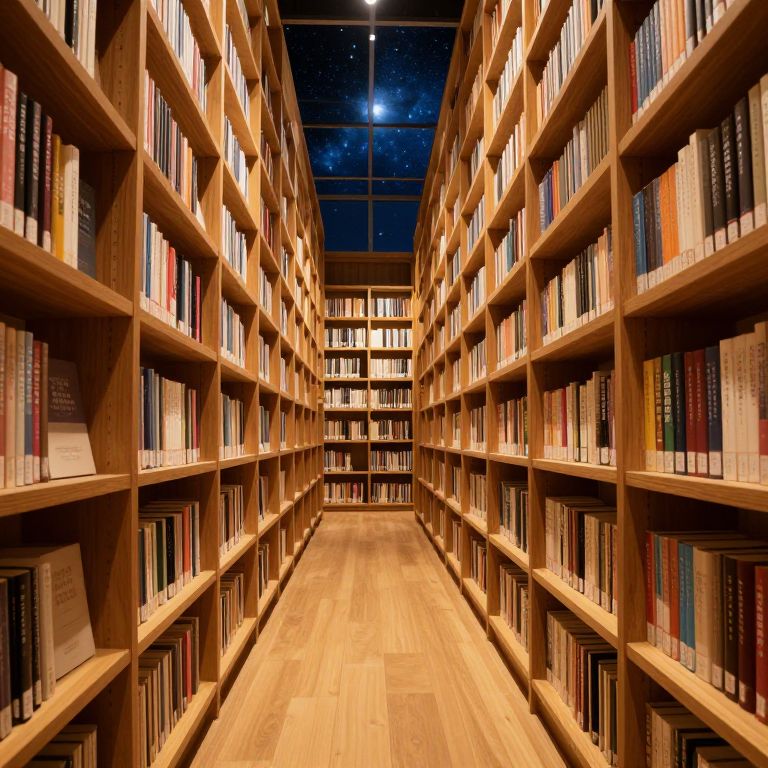 Immersive library aisles stretch endlessly, illuminated by warm wooden shelves stocked with countless books, while a celestial night sky peeks through a central window, casting a serene glow over the scene.