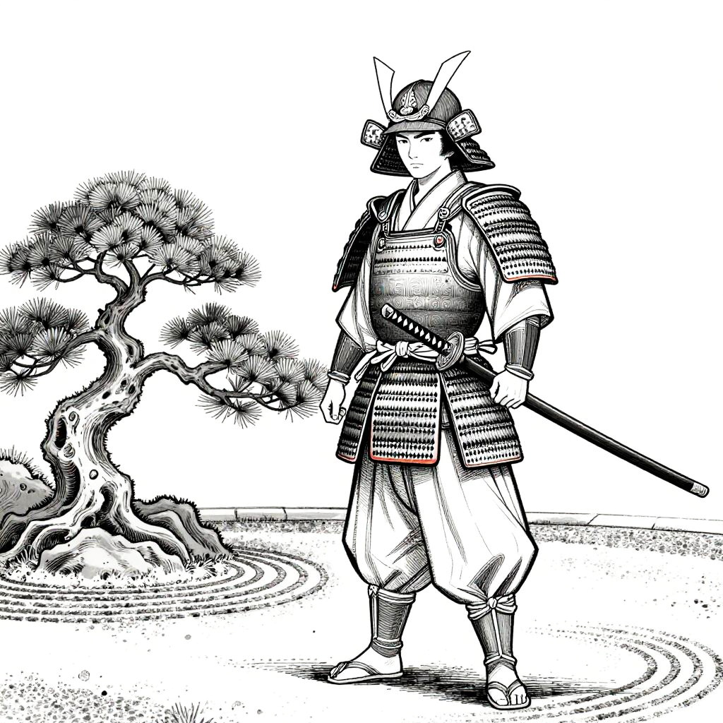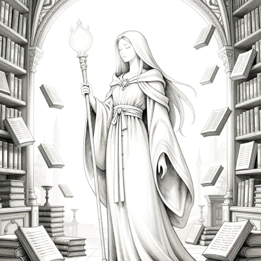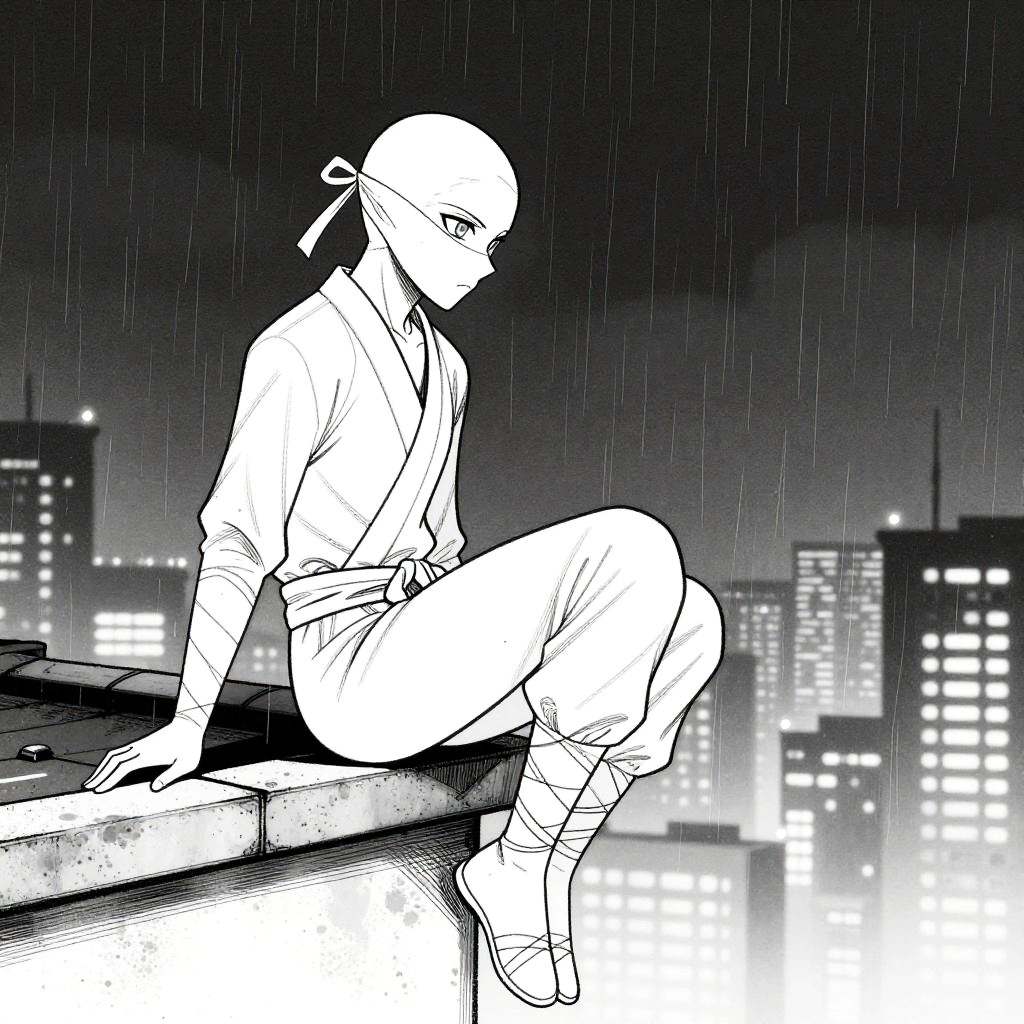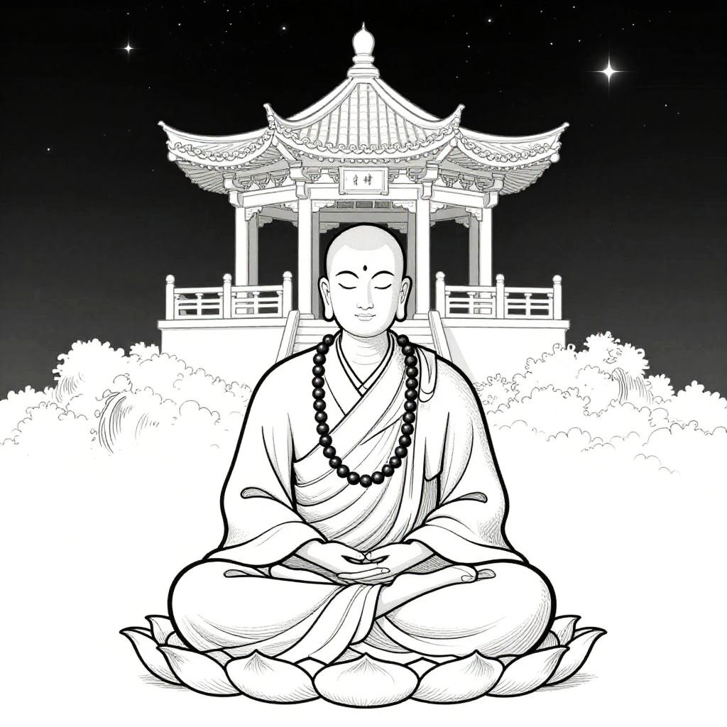 Line art illustration of serene monk meditating in lotus pose with beads in mountaintop temple pavilion under starlit sky, intricate black and white fine lines, elegant minimalist composition with crisp negative space, graceful contours, subtle crosshatching and stipple for depth, clean vector linework paired with gentle shading, serene mystical atmosphere, balanced framing, high-resolution, timeless monochrome elegance