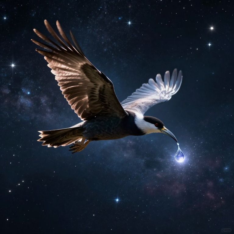 A majestic bird soars through a cosmic expanse, its outstretched wings bathed in starlight, as a single droplet from its beak transforms into a shimmering, miniature universe, suspended in the void.