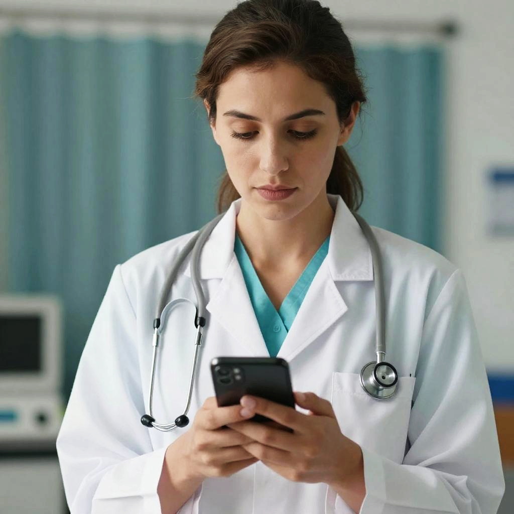 Photograph of a focused female doctor with light olive skin and brown hair tied back. She's wearing a white lab coat with a teal shirt underneath and a stethoscope around her neck. She's looking down at a black smartphone she's holding with both hands. The background is blurred, showing teal curtains and some medical equipment. She has a calm, concentrated expression.