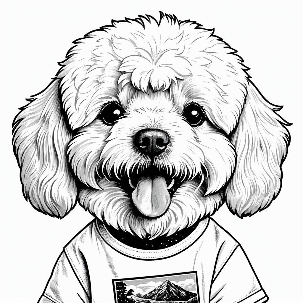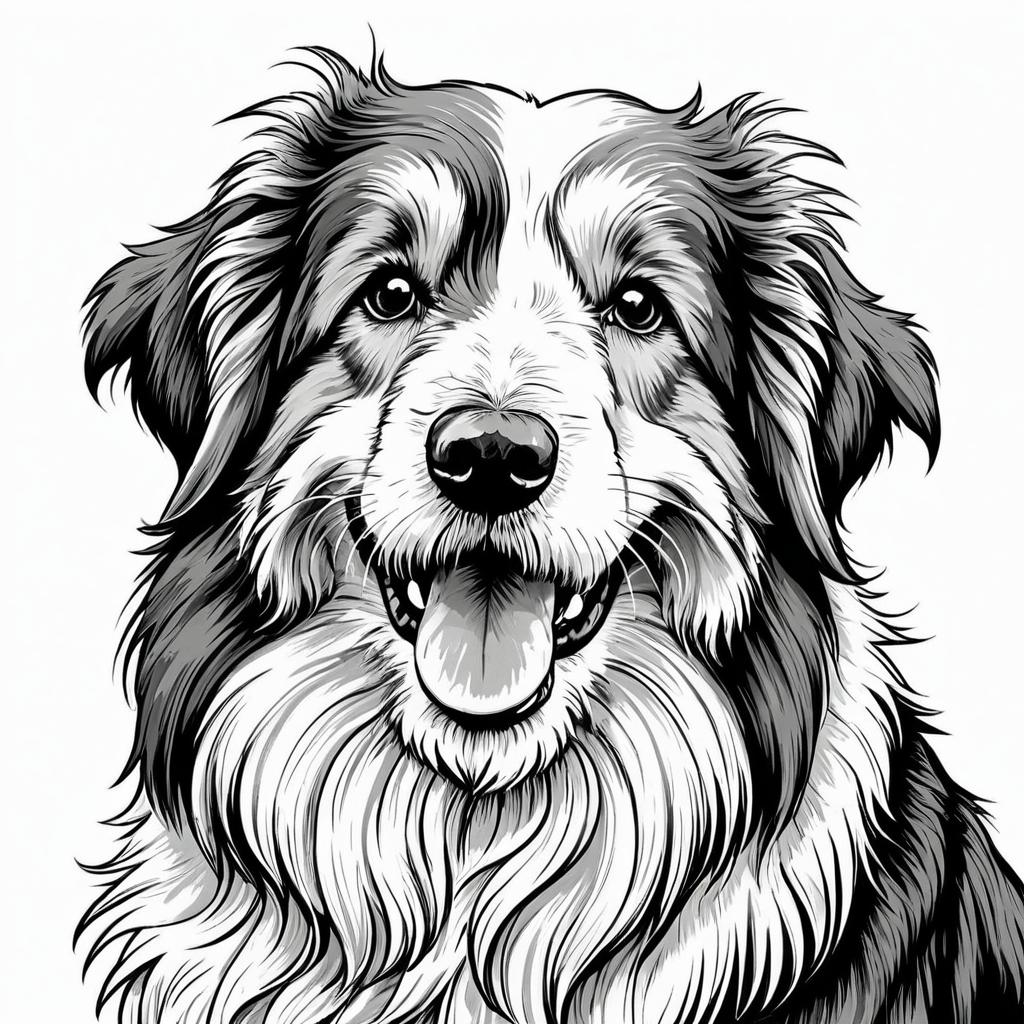 Vector illustration of a smiling Alaskan Malamute dog wearing a jacket with tongue out. Black and white minimalistic design on white background, suitable for t-shirt graphics. Artwork features detailed fur texture and a complimentary color scheme with subtle pink tones on the tongue.
