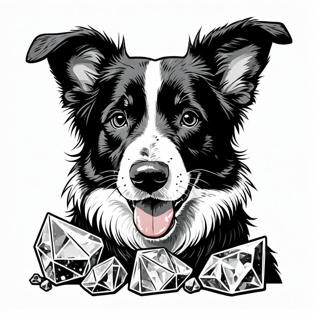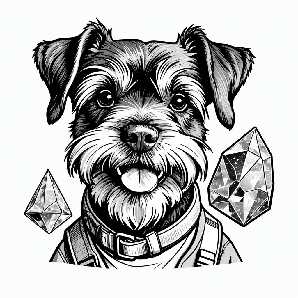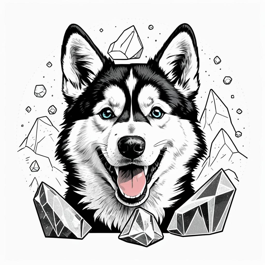 Toned Paper vector illustration of a alaskan malamute geologist, kawaii cute, close up, t-shirt graphic, black and white, white background, minimalistic, smiling, tongue out, style of toppi, style of bernie wrightson, quartz crystal vignette, complimentary color scheme,