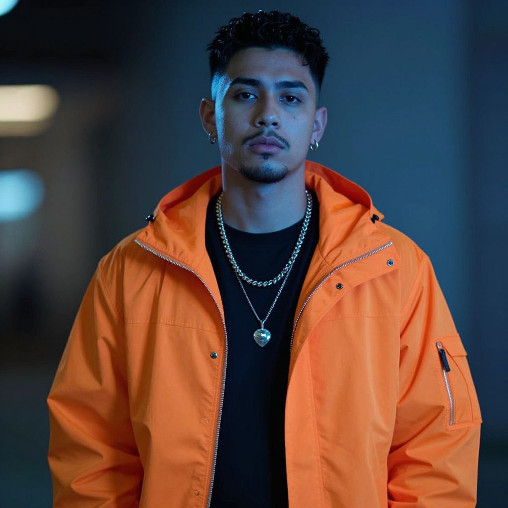 Neon outfit man, 1boy, male focus, solo, jacket, jewelry, necklace, blurry background, blurry, orange jacket, upper body, black hair, earrings, facial hair, hood