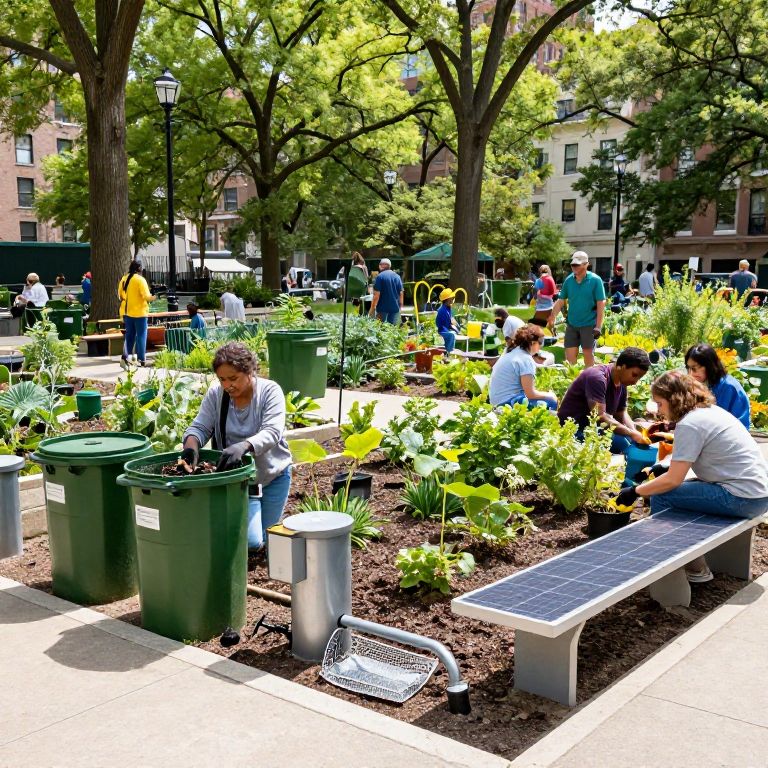 A vibrant community garden in a city park, showcasing eco-friendly practices like compost bins, rainwater harvesting systems, and solar-powered benches, with people of diverse ages and backgrounds gardening together, sunlight filtering through trees
