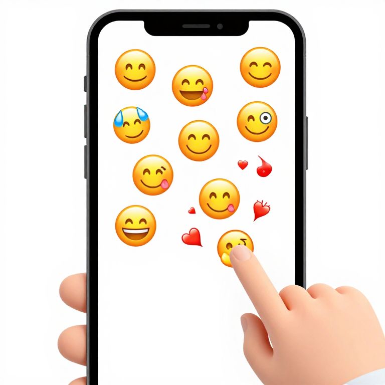 Photograph of a black smartphone with a white screen displaying a grid of 11 yellow smiley faces in various expressions, including winking, blushing, sweating, and hearts. A light-skinned hand with a pinky finger extended touches the screen, selecting a heart-shaped smiley face. The background is plain white, emphasizing the smartphone and its expressive icons. The image has a clean, modern, and playful style.