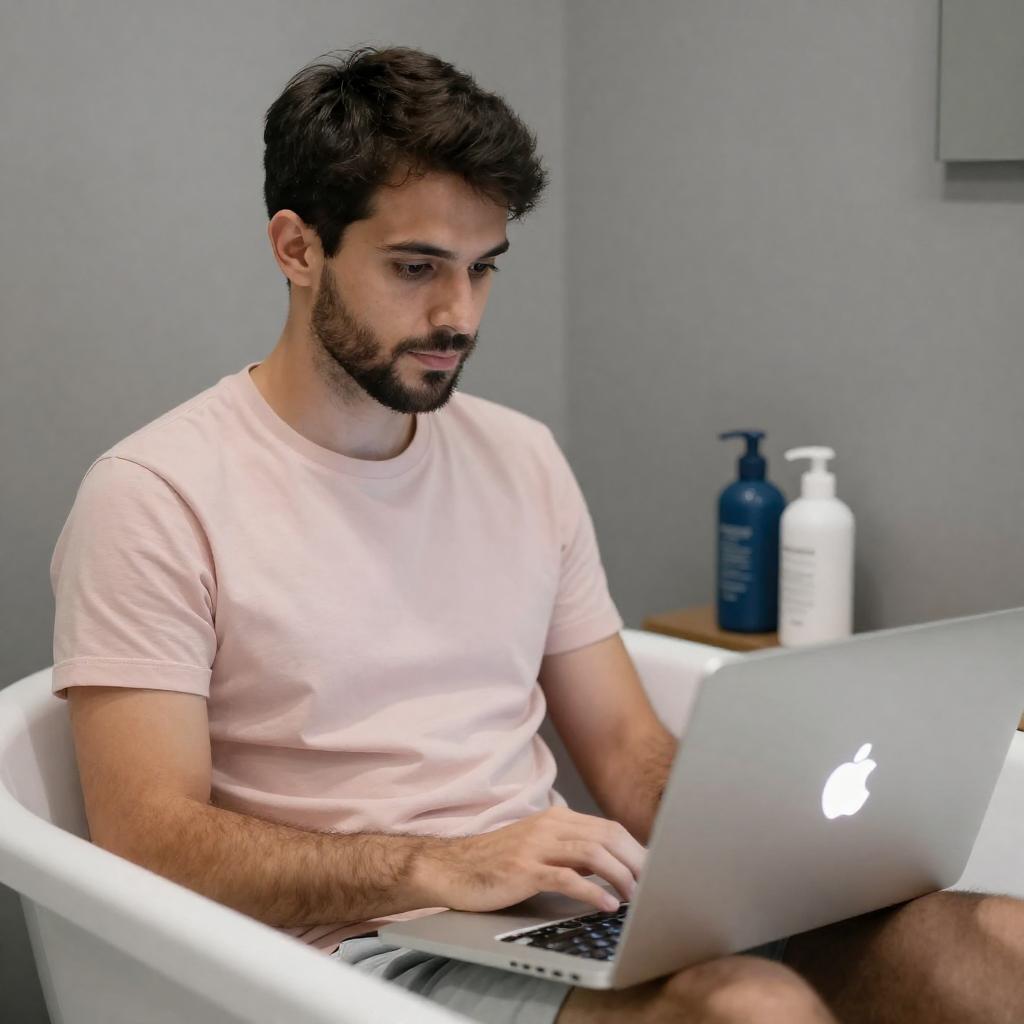 Man with brown hair and beard, wearing a dark jacket, sitting at a desk with a computer. Computer screen shows a graph. Man looks over his shoulder with a slight smile. Dimly lit room with a blurred background. One person.