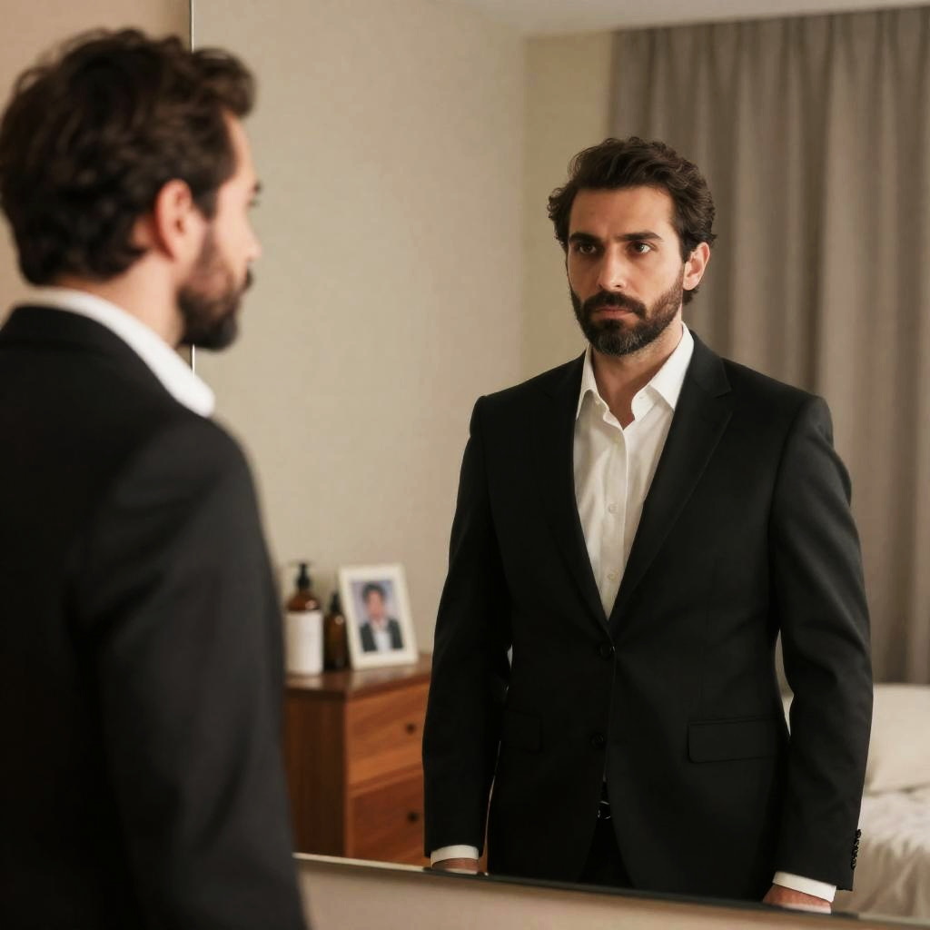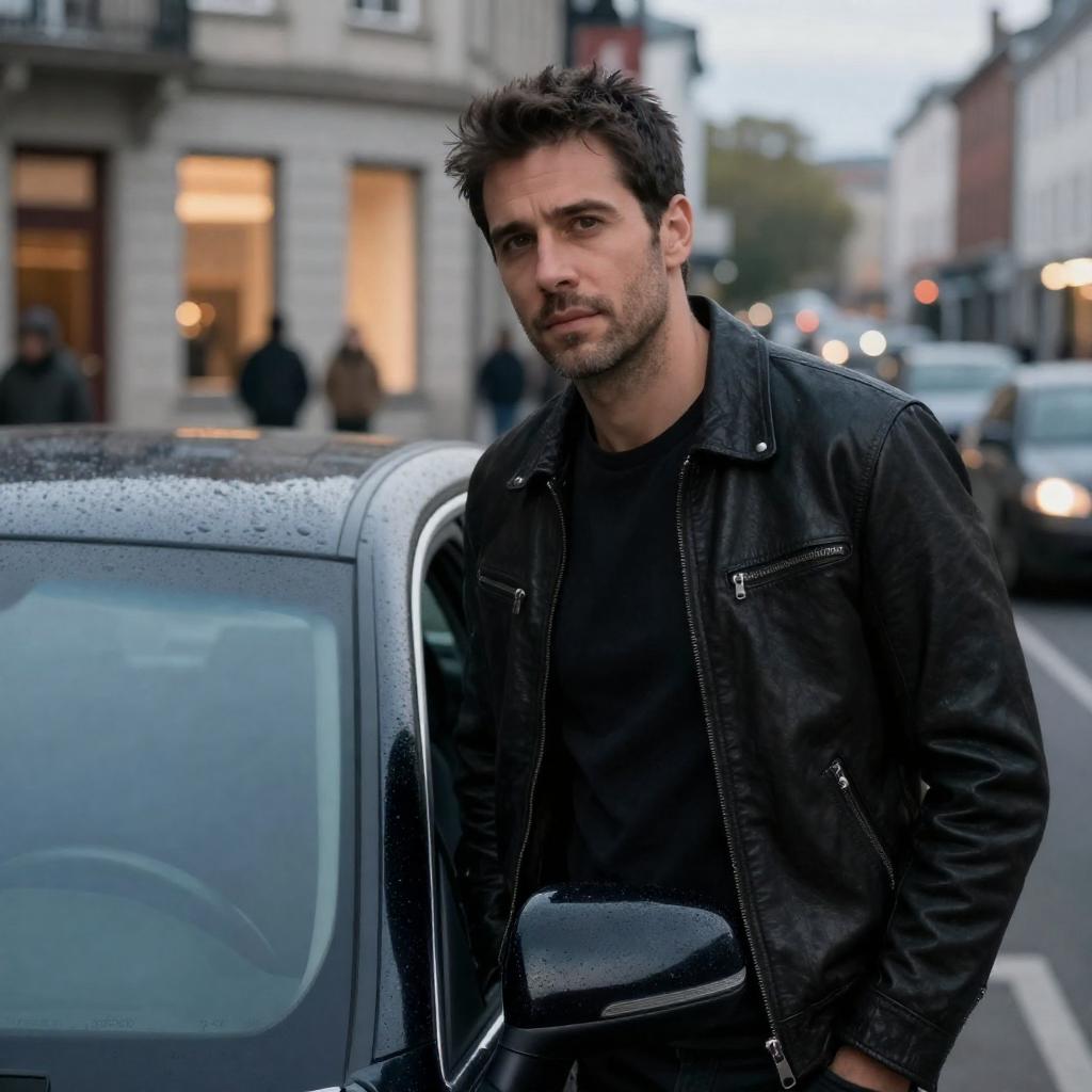 Photograph of a man with medium-length brown hair and a beard, wearing a green shirt, leaning on the car window. His arm is outside, and his intense gaze is directed forward. Background is blurred with sunlight and indistinct shapes. Car interior visible with a side mirror.
