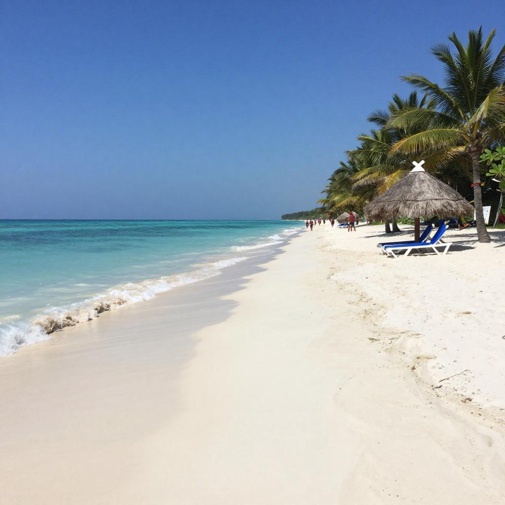 Photograph of a stunning, pristine beach with bright white sand stretching into the distance. The turquoise ocean gently laps at the shore, blending into a deeper blue as it meets the clear sky. A small thatched hut with two blue lounge chairs sits to the right, surrounded by palm trees. A few distant figures walk along the shoreline, enjoying the sun and sea.