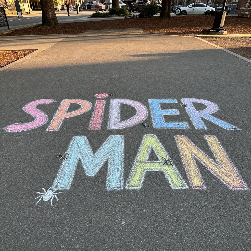 Spiderman text in chalk art style on pavement, colorful chalk textures with smudges and chalk dust, playful and creative lettering with tiny spiders crawling on the text, warm daylight setting in a city park, inviting and artistic urban feel